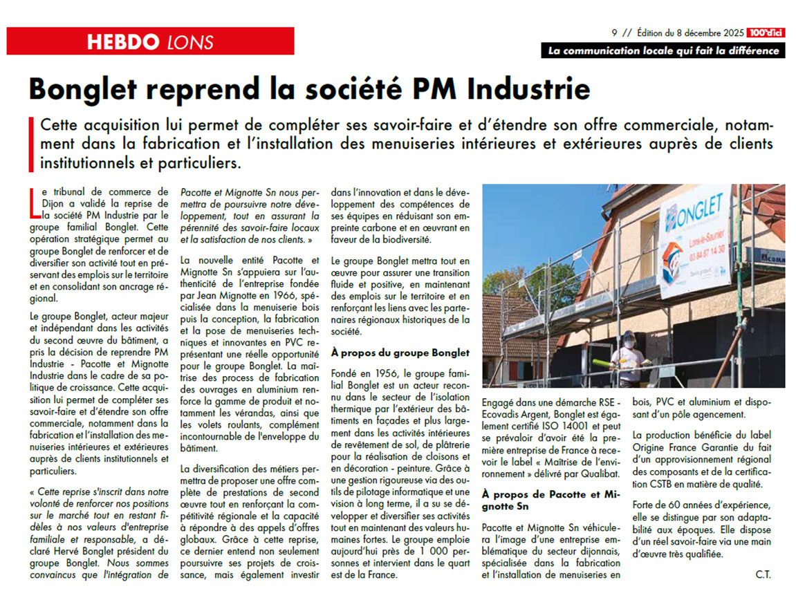 Revue de presse : Bonglet reprend la société PM Industrie
